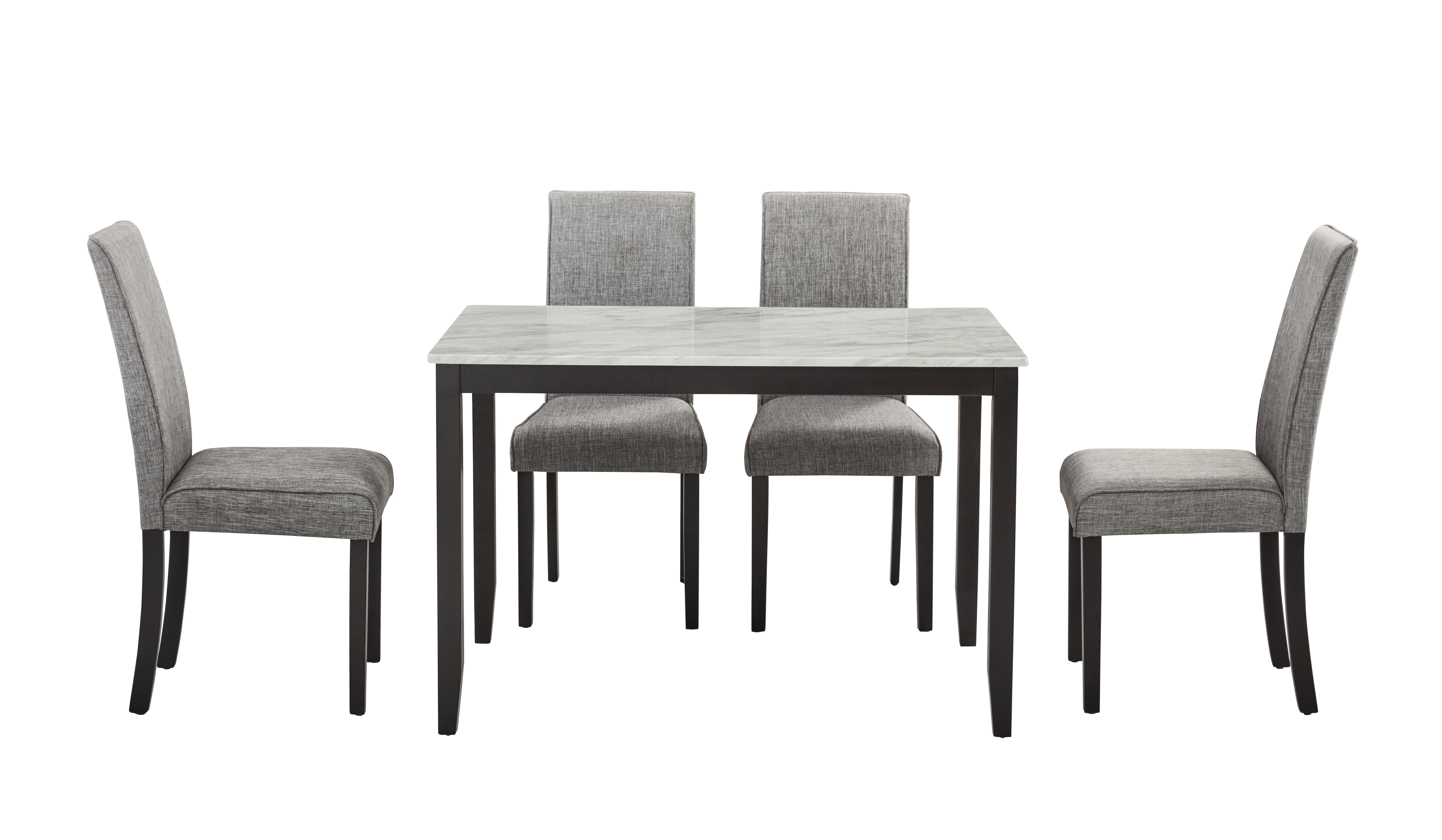 5 Pieces Dining Table Set: This dining table set includes a gorgeous rectangular faux marble table and four stylish upholstered dining chairs. It's perfect for families and guests alike! The faux marble dining table is not only a stunning visual treat but also a practical choice. The coated and finished table top is stain resistant and can be easily cleaned with a damp cloth. Effortlessly maintain a glossy and smooth finish to create an impeccable dining space.