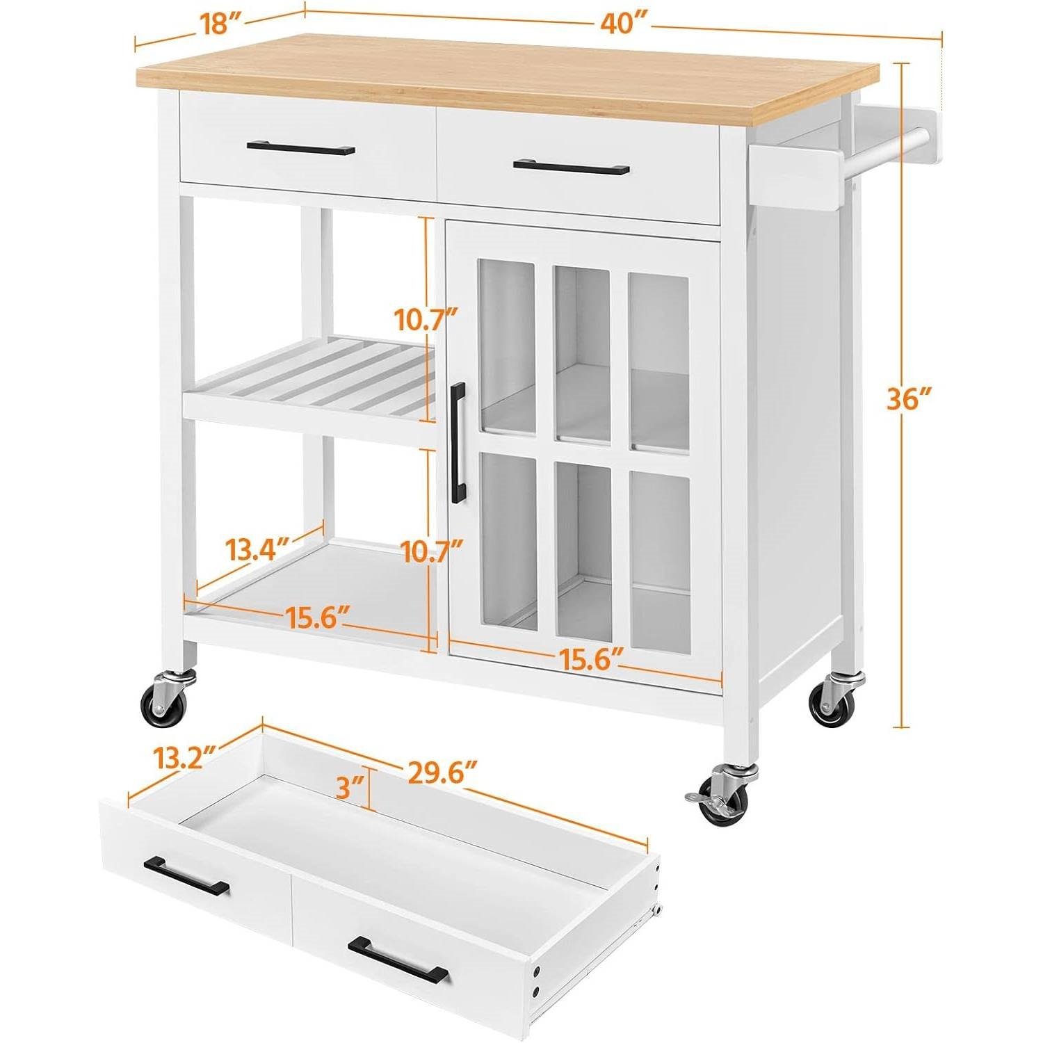 This White Kitchen Island Cart with Wood Top Storage Cabinet and Locking Casters is founded atop 4 caster wheels that provide must-have maneuverability. With a four-wheel base, it can go anywhere you need it and the 2 locking casters can keep it in place if needed. Measuring 91.5cm/36” long 45.5cm/18” wide, the bamboo countertop gives you extra elbow room as you prep, serve, and stow. And its varnished surface is easy to clean with a damp cloth. The transparent tempered glass door makes sure you can spot things you want inside the cabinet quickly. The interior shelf can be adjusted to three different heights to accommodate your storage needs. This kitchen island cart sports a classic finish for a neutral and elegant look and works well in both classic and contemporary kitchens. It also serves perfectly as a coffee bar or a place for cocktails when paired with counter-height stools. This kitchen island cart comes with step-by-step assembly instruction and numbered parts and hardware to make sure you can set it without difficulties. An Allen Key is also included for your convenience.