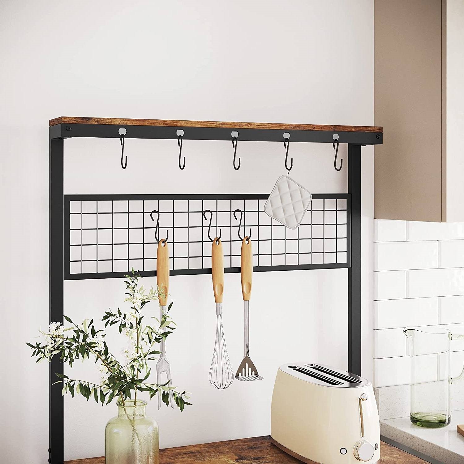 This 3-Shelf Black Metal Rustic Brown Wood Kitchen Baker's Rack Microwave Stand would be a great addition to your home. Specifications: - Color: Rustic Brown, Matte Black - Material: Particleboard, Iron - Total Size: 33.1"L x 15.7"W x 66.9"H (84 x 40 x 170 cm) - Product Weight: 39.6 lb (18 kg) - Max. Static Load Capacity of Each Wooden Shelf: 66 lb (30 kg) - Max. Static Load Capacity of Metal Mesh Shelf: 44 lb (20 kg) - Max. Static Load Capacity of Each Hook: 6.6 lb (3 kg) - Max. Static Load Capacity of Top Narrow Shelf: 22 lb (10 kg) Package Contents: - 1 x Kitchen Shelf - 10 x Hook - 2 x Anti-Tip Kit - 1 x Accessory Bag - 1 x Instructions Notes: - Avoid long time exposure to strong sunlight. - Avoid contact with sharp or pointed objects. - Please do not place overweight items on the product. - Please fix the product to the wall with the anti-tip kit. If all of these are essential items for you, don’t worry! Strong steel frame and quality 15 mm thick chipboard have the strength, so you can put nearly all you need on this kitchen shelf. Place pots on the 3 shelves, customize the mesh panel by hanging cups and potholders, leave ladles and spatulas on the top hooks, and use the top narrow shelf for spice jars—now it's up to you! You don’t need to an expert on the assembly of this kitchen shelf, as it comes with numbered parts and step-by-step instructions to make it easy-peasy.
