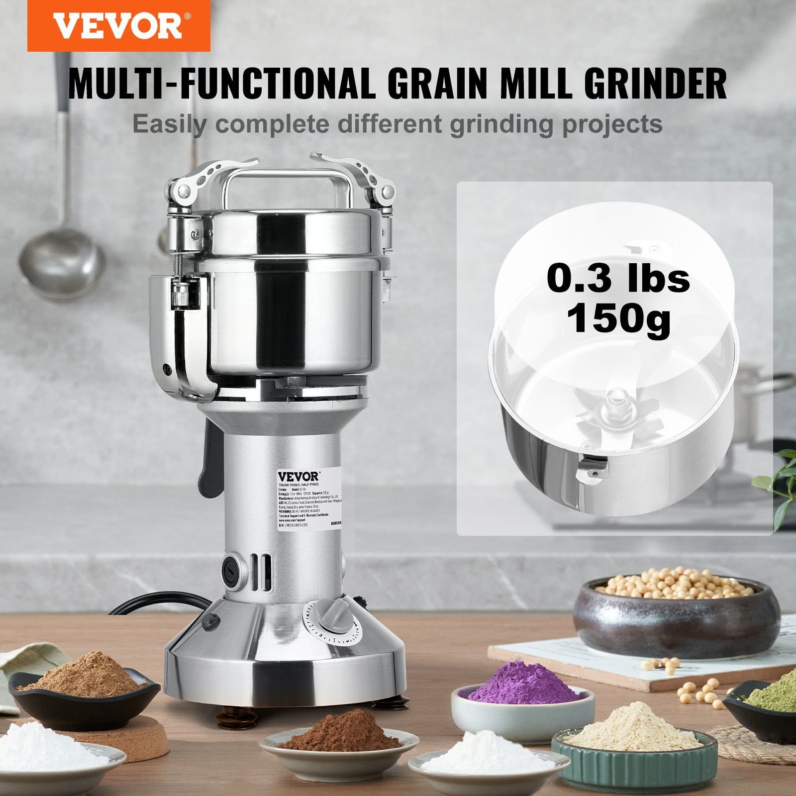 Home > VEVOR 150g Electric Grain Mill Grinder, High Speed 1050W Commercial Spice Grinders, Stainless Steel Pulverizer Powder Machine