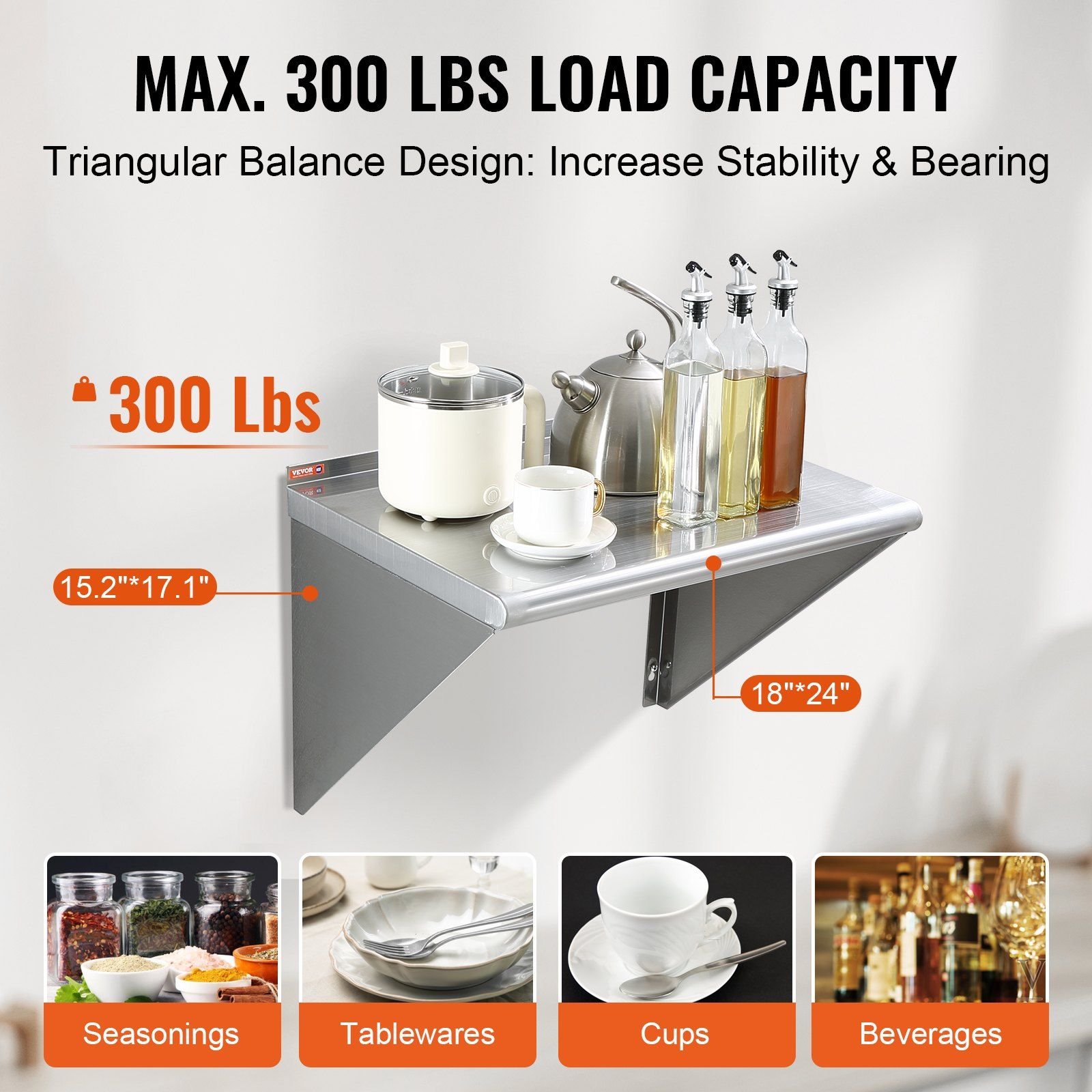 Home > VEVOR 18" x 24" Stainless Steel Shelf, Wall Mounted Floating Shelving with Brackets, 300 lbs Load Capacity Commercial Shelves