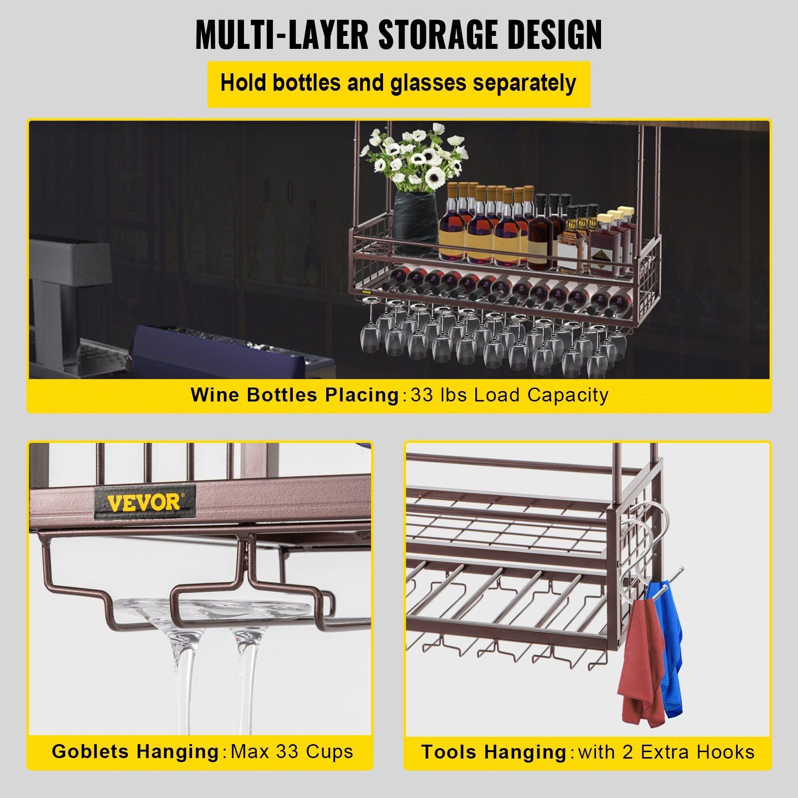 1.Two-in-one Heavy Duty Rack: Our ceiling wine glass rack adopts a multifunctional design. The 46.9 x 11.8 x 9.8 inches shelf can be used to store wine bottles, while the bottom hanger is well-designed for holding a maximum of 33 glasses, satisfying your demands in placing plenty of bottles and glasses up to 33 pounds. Besides, the 2 extra offering hooks are perfect for hanging tools like cleaning cloths or bottle openers.