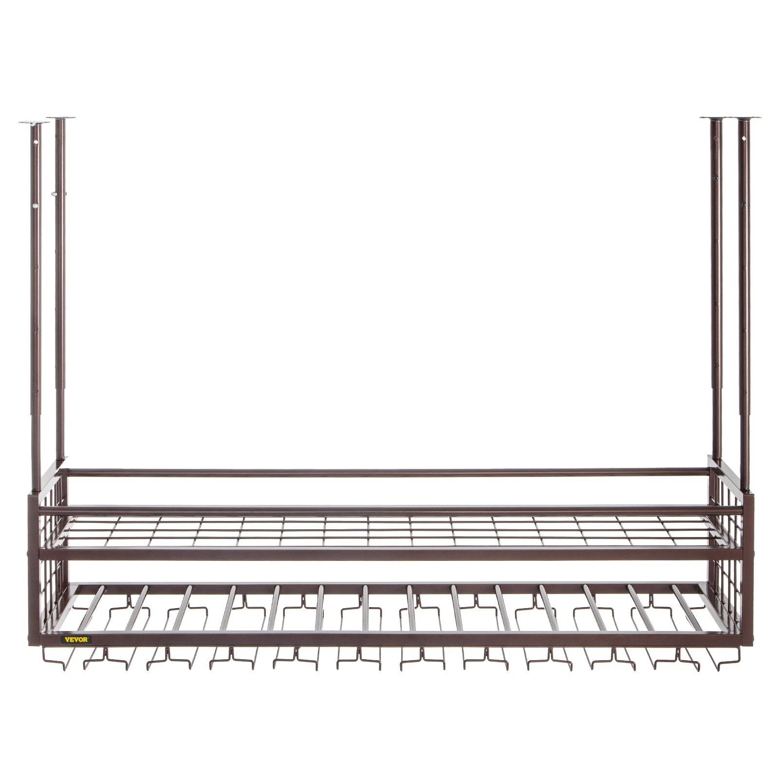 Our hanging wine glass rack is well-designed for holding wine bottles and goblets with up to 33 pounds capacity. The height of the four poles are adjustable to fit different space sizes. Its bottom layer can hold various goblets with less than a 1.6-inch base diameter. It's reliable to use with alloy plating process and security guardrail. Besides, it's easy to assemble and operate. This wine glass rack is ideal for wine lovers.