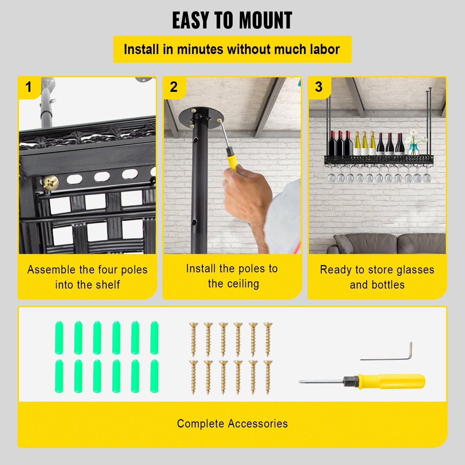 4.Convenient Installation: The simplified structure allows you to assemble this wine glass rack effortlessly, saving you a lot of time and energy. It only requires you to install the four poles into the shelf by tightening the screws, and then you need to fix the whole rack to the ceiling through the pre-drilled holes on the top of the poles. After that, our hanging rack is ready to put your wine bottles and glasses.