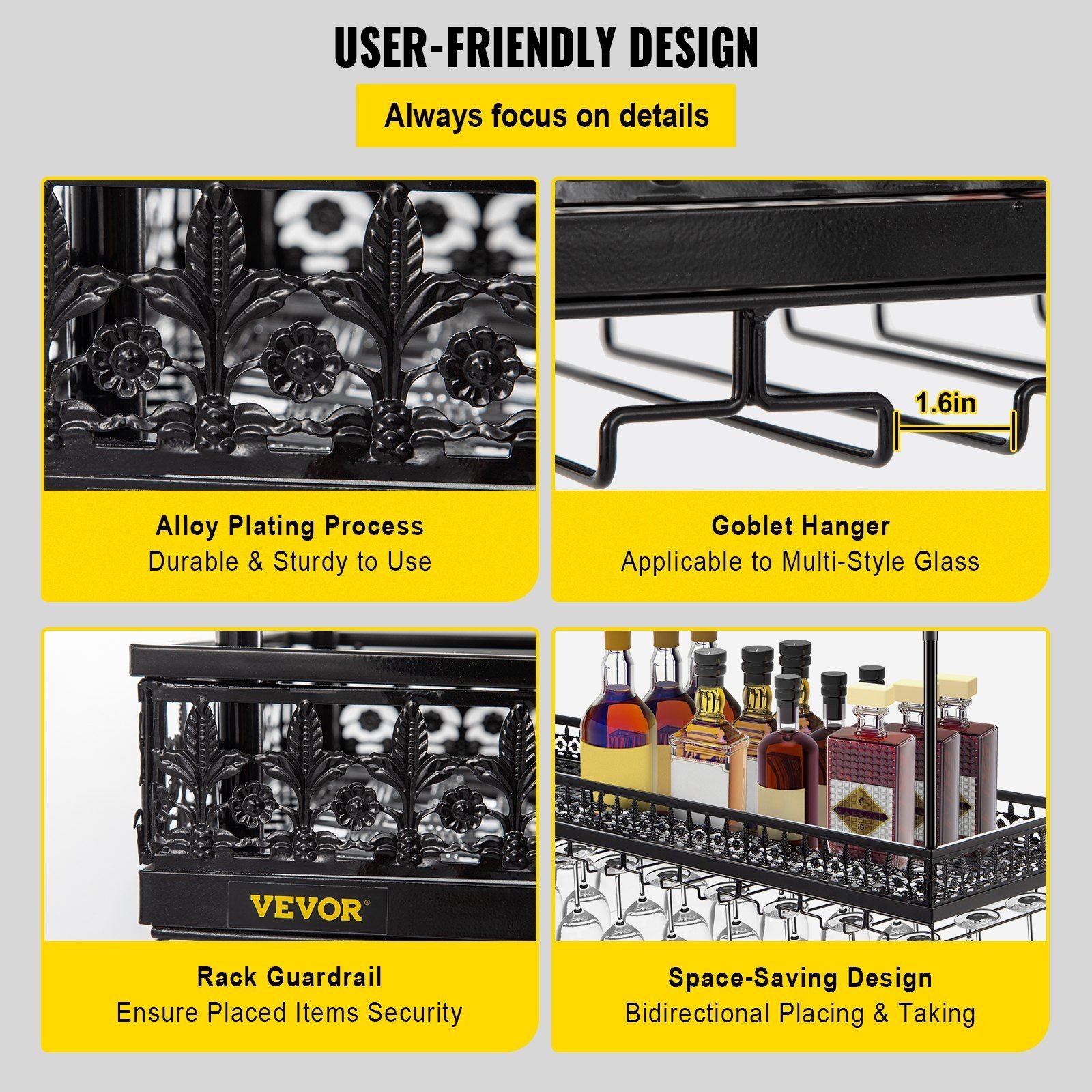 Our ceiling wine glass rack adopts an alloy plating process for durable and sturdy use. The security guardrail is equipped for keeping the wine bottles steadily placed on the rack. And the ceiling-mounted design with upside-down goblets is convenient for putting and taking bottles and glasses in the front and rear directions.