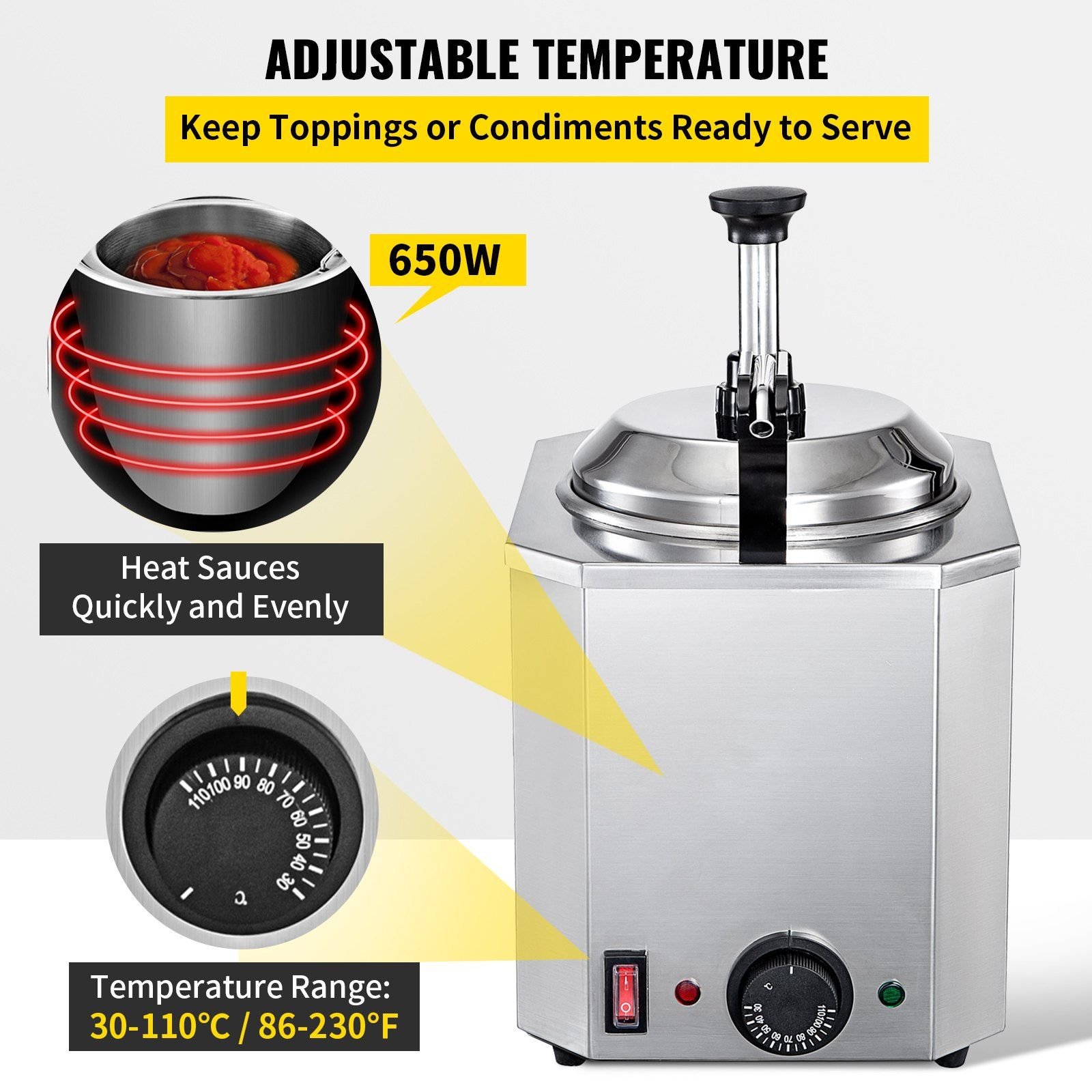 3.Convenient Temp Control: A rotary button for easy adjustment of temperature (30-110°C / 86-230°F). A 650watt band heating element block is attached to the pump to ensure that the temperature of condiments is optimal. 2 indicator lights directly show the working status. Don't miss a step with our warmer.