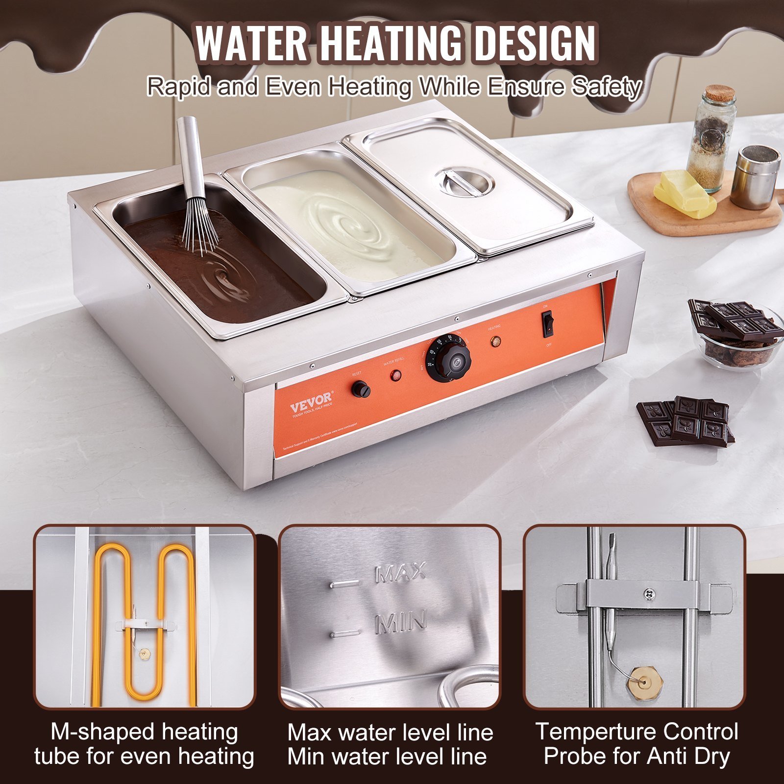 The interior of this chocolate melting pot consists of a U-shaped heating tube and water bath heating, preventing chocolate from sticking to the bottom. It ensures even heating of the chocolate, better fluidity of the mixture, and smoother sauces.
