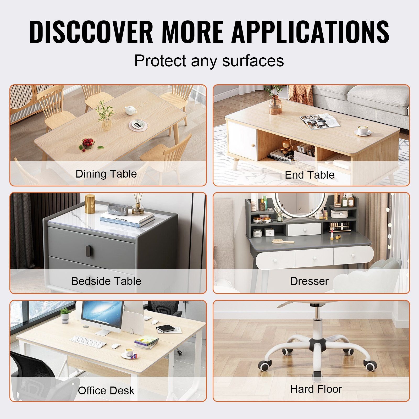 5.Versatile Applications: Our clear table cover protector can enhance a variety of environments, including homes, offices, restaurants, and event venues. They are suitable for wooden textured desktops such as dining tables, kitchen countertops, work desks, end tables, computer tables, dressers, TV cabinets, computer desks, and more. Unlock limitless possibilities and enhance your experience!