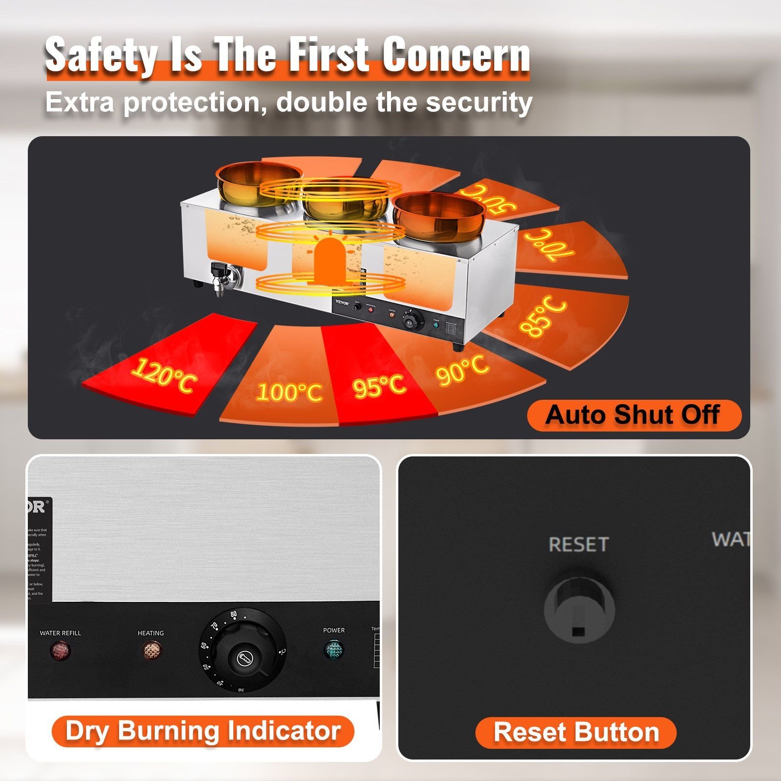 3.Additional Security: We have upgraded our food warmer with newly designed “Dry Burning Indicator” and “Reset Button”. The dry-burning protection function automatically stops heating the food when the temperature exceeds 248°F (120°C). To resume operations, simply refill the water and press the Reset Button.