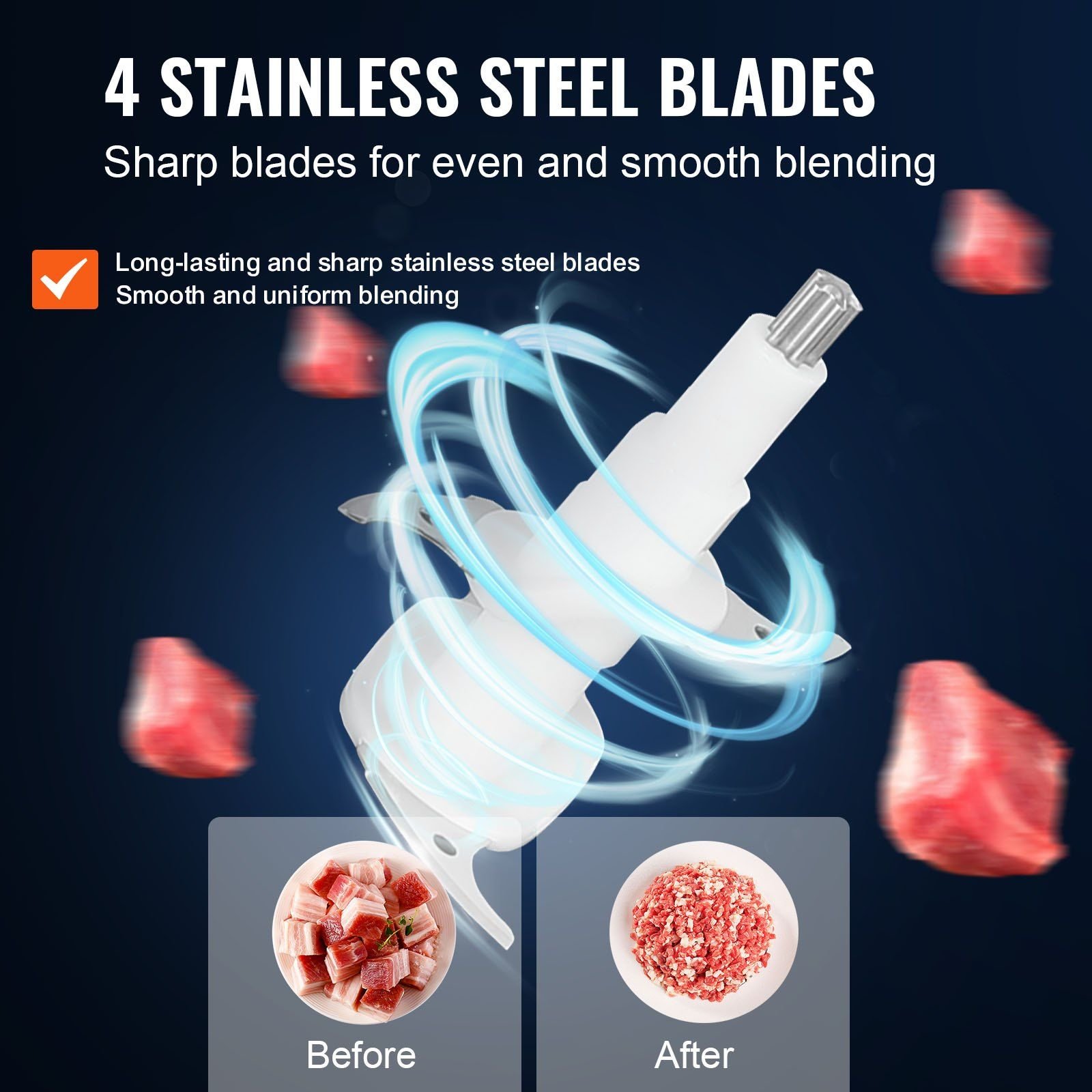2.Efficient and Uniform Chopping: Equipped with a powerful 400W motor and a four-wing stainless steel blade, the meat processor can effectively stir ingredients to achieve a more uniform and smooth state. It can chop and grind various ingredients, whether onions, meat, ham, garlic, small herbs, batter, juice, etc., easily reach the state you want to take your cooking and taste to the next level!