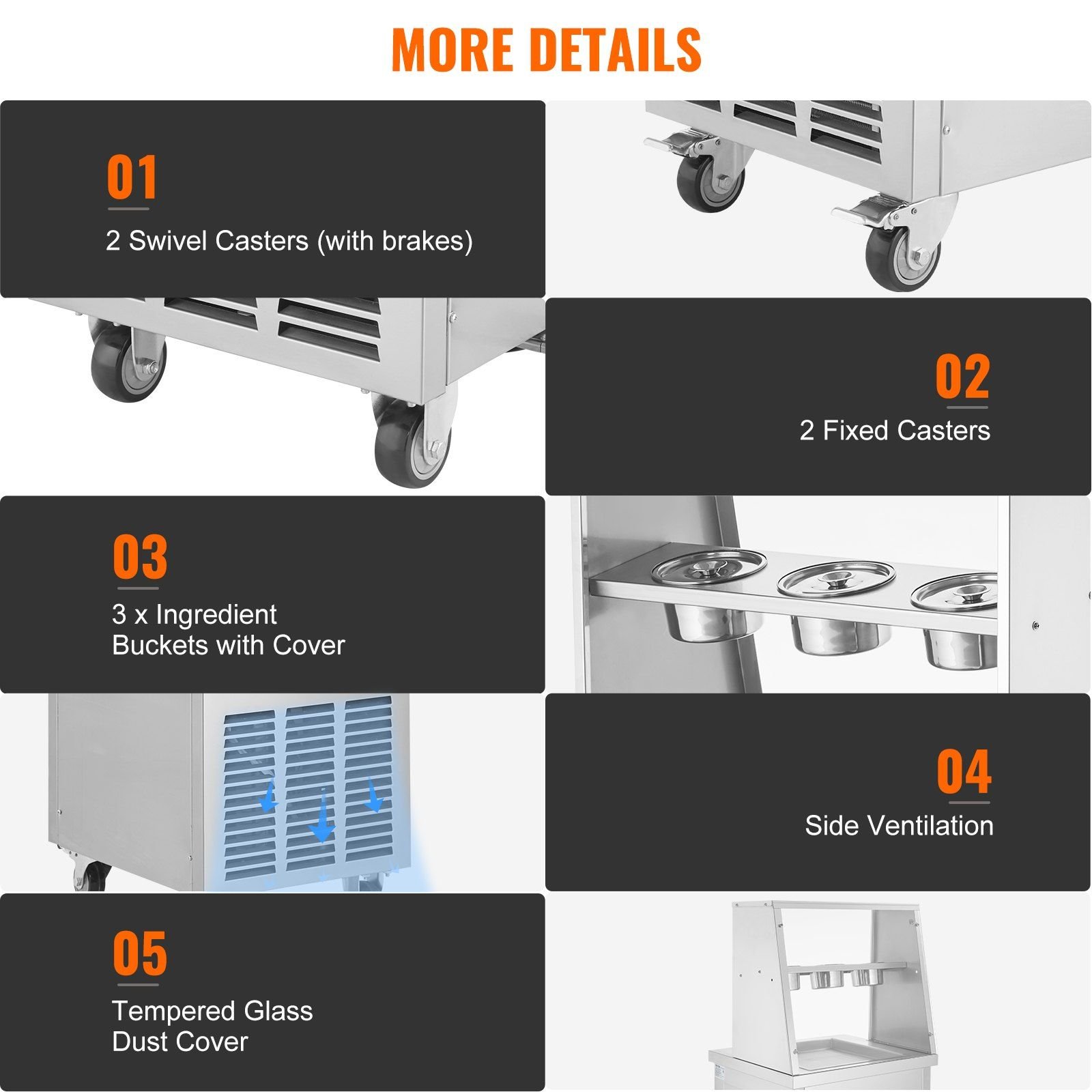 4.Stainless Steel Construction: The food-grade SUS304 stainless steel for the ice cream pan and SUS201 stainless steel for the exterior ensure rust resistance and corrosion prevention, making it easy to clean.
