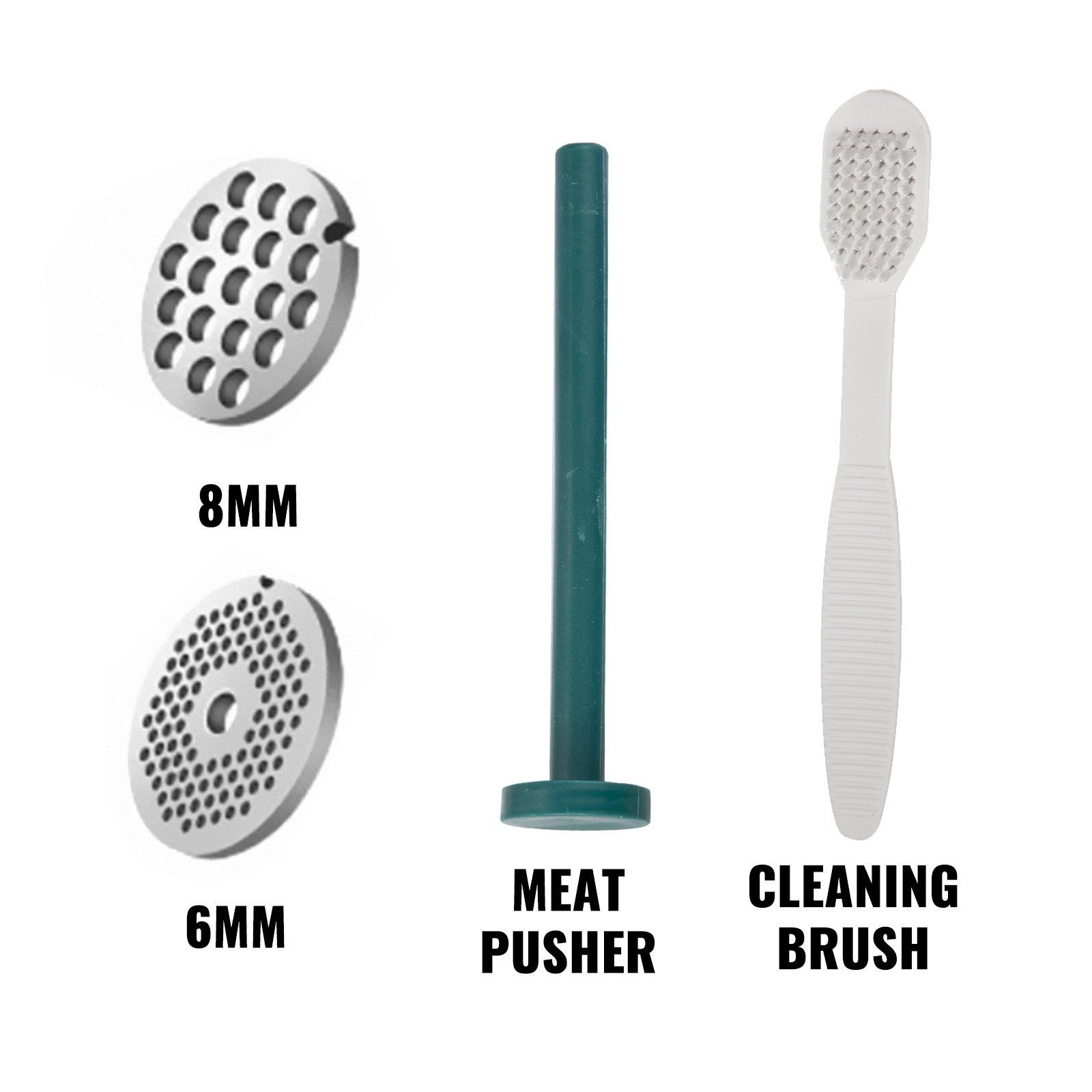 8 mm hole plate and 6 mm hole plate are included to meet different processing needs. A push rod to add ingredients. It also features the shaft sleeve and cleaning brush.