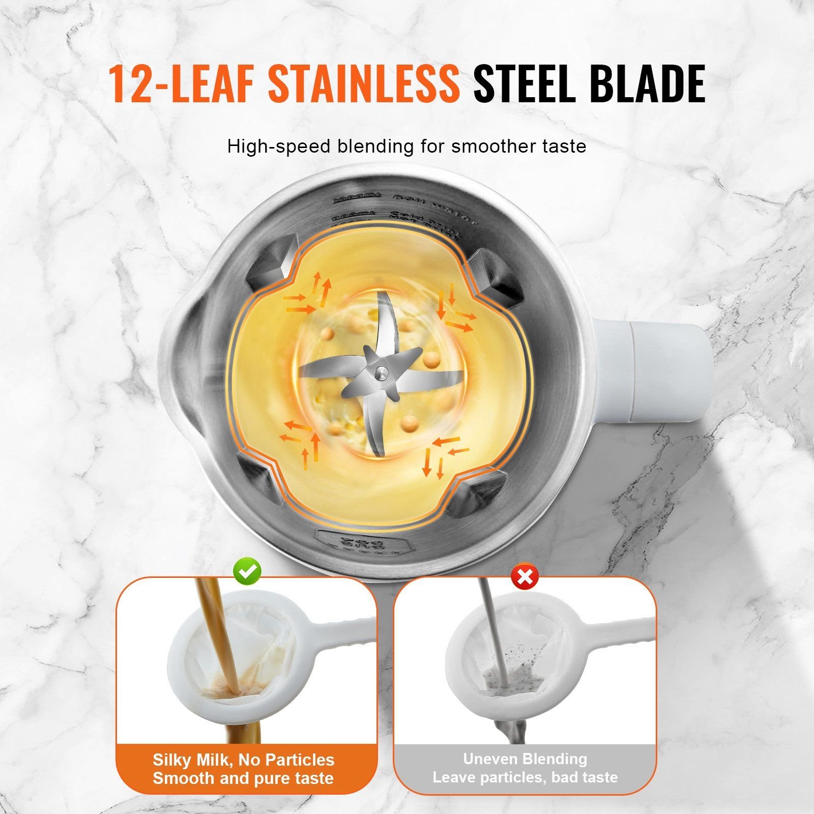 2.Speedy Blending, Smoother Taste: Say goodbye to uneven blending! Our soy milk making machine comes with 12-leaf stainless steel blades, sturdy and sharp. Its multi-blade structure ensures rapid and thorough 2blending, leaving you with silky-smooth, residue-free beverages.